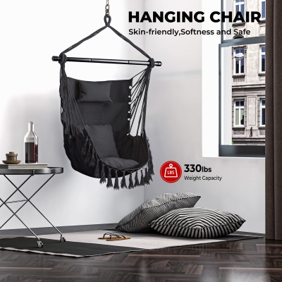 Hammock Swing Chair, Hanging Rope Swing w/Detachable Steel Bars, Side Pocket, Head Pillow & 2 Cushions