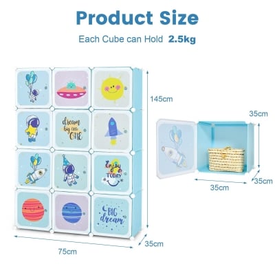 Portable Kids Wardrobe, 12-Cube Baby Closet Organizer for Children with Doors & Hanging Section
