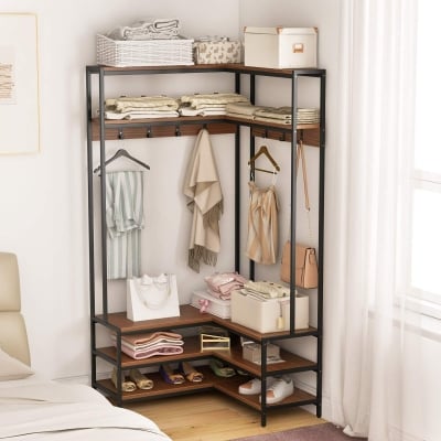 L-shaped Corner Garment Rack Clothes Rack Storage Organizer with Shoe Bench